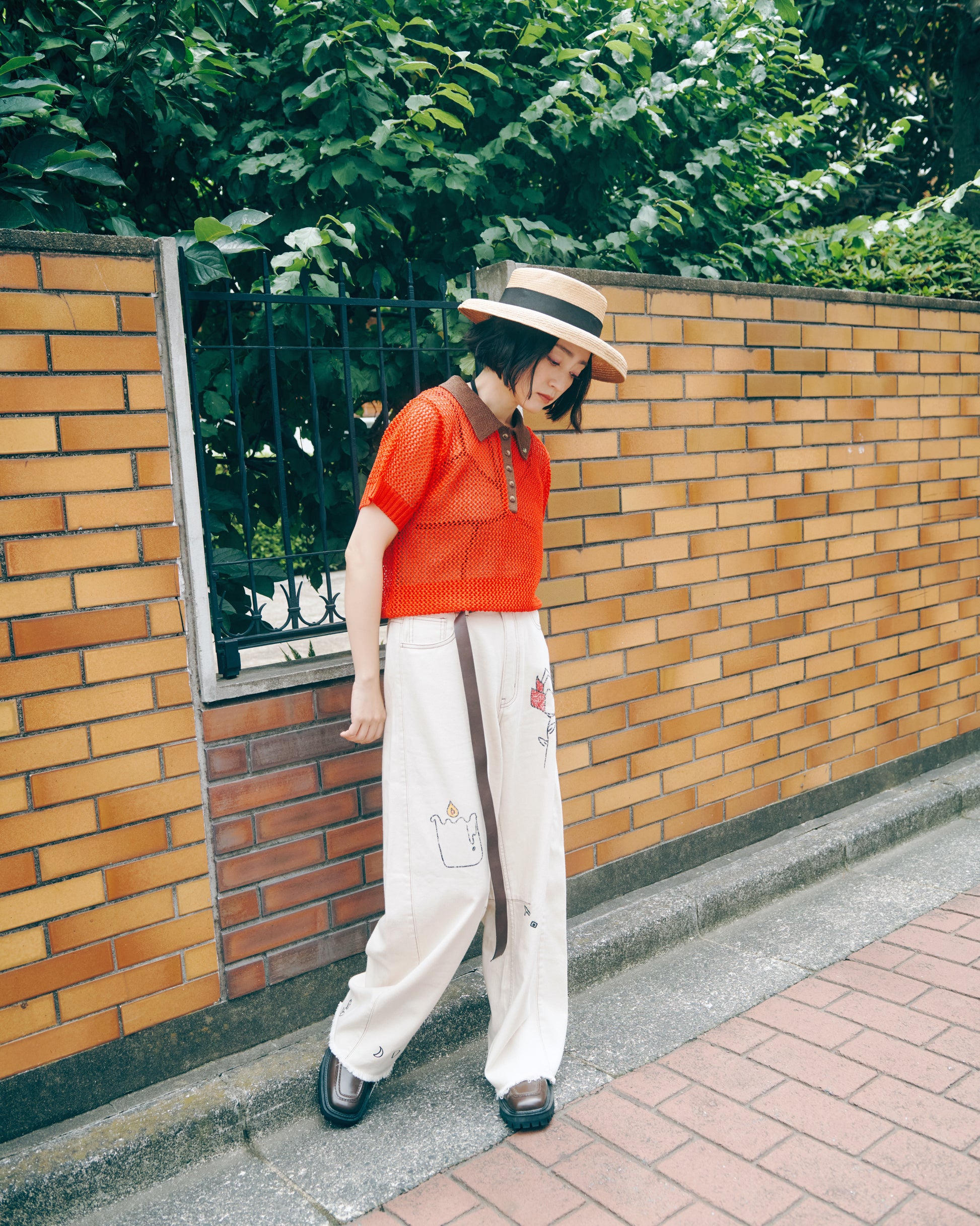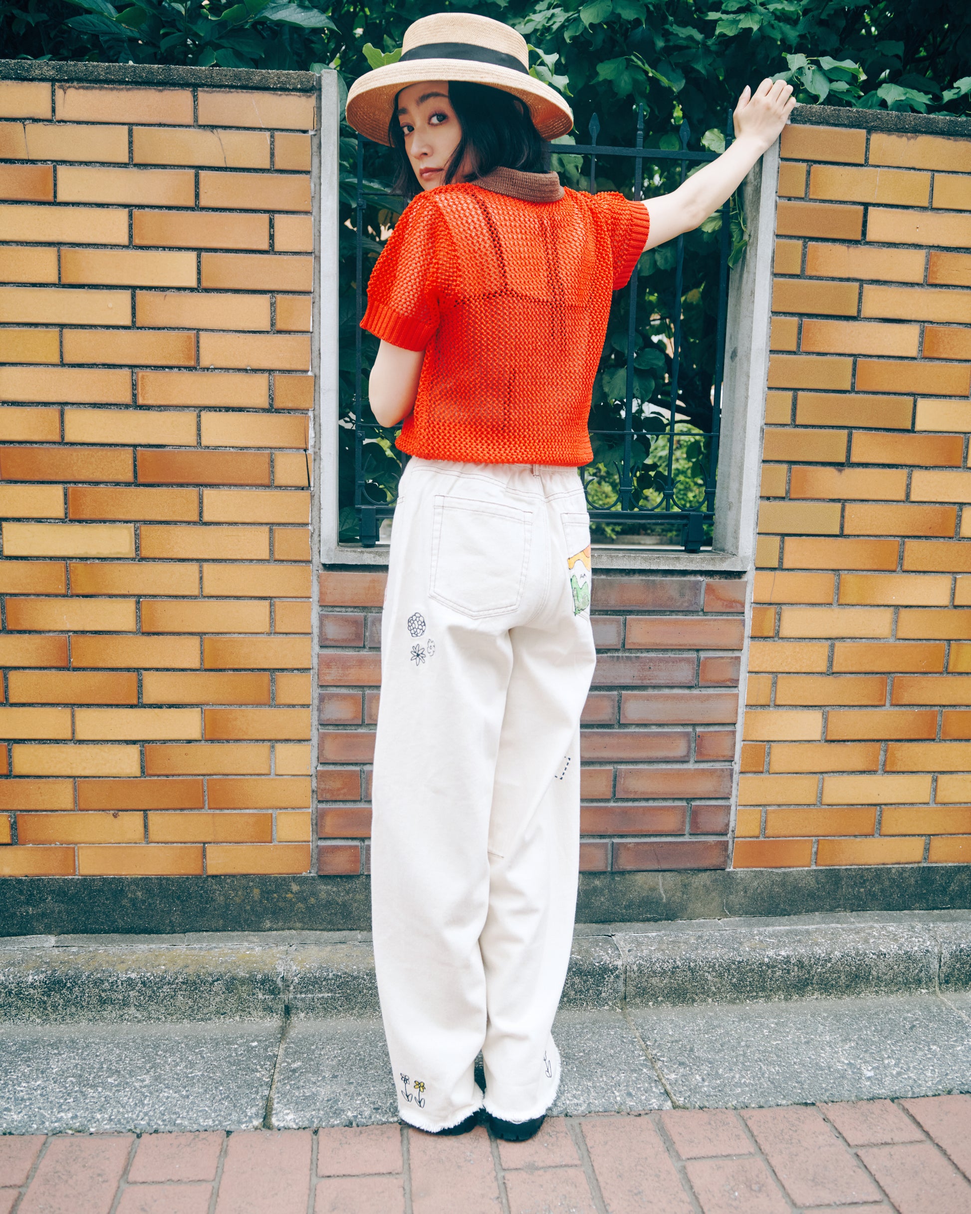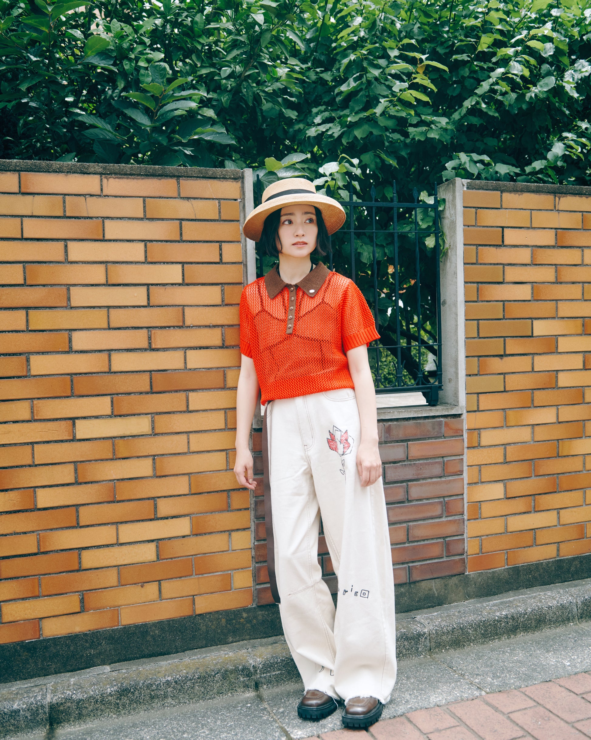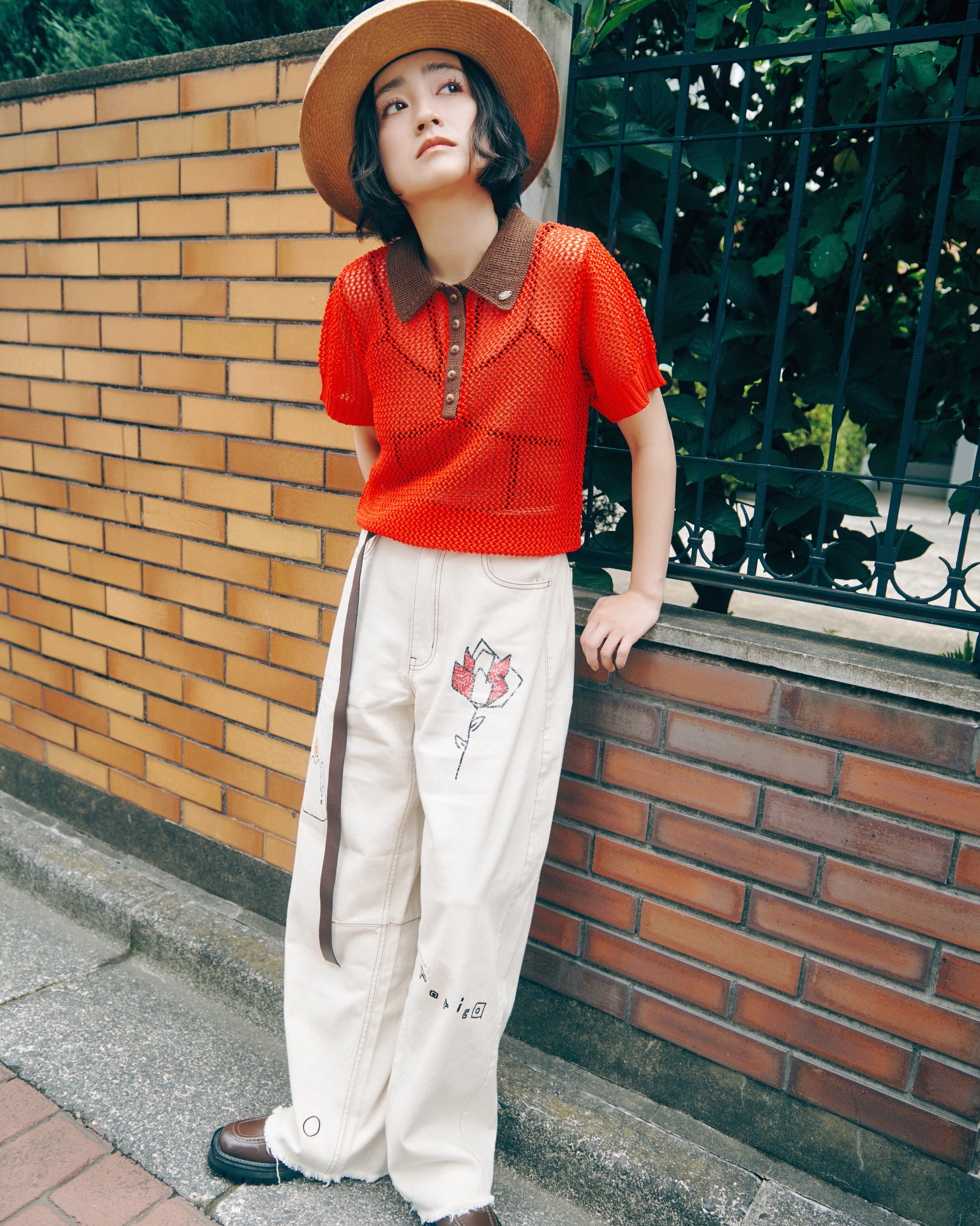 「Torico Knit Polo Shirt」の襟のプレートと呼応するお花モチーフが大胆にプリントされ、セットアップ風に楽しむのもおすすめです。