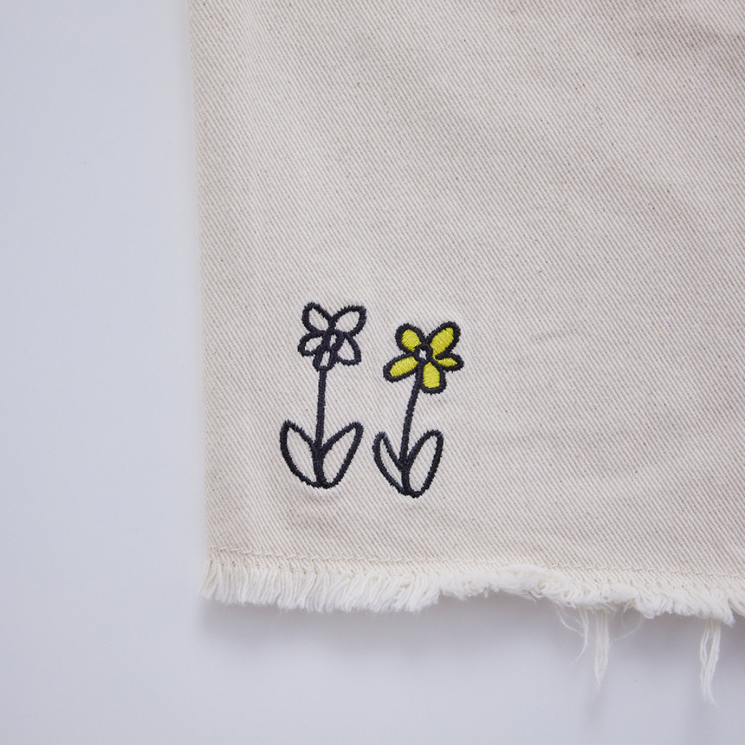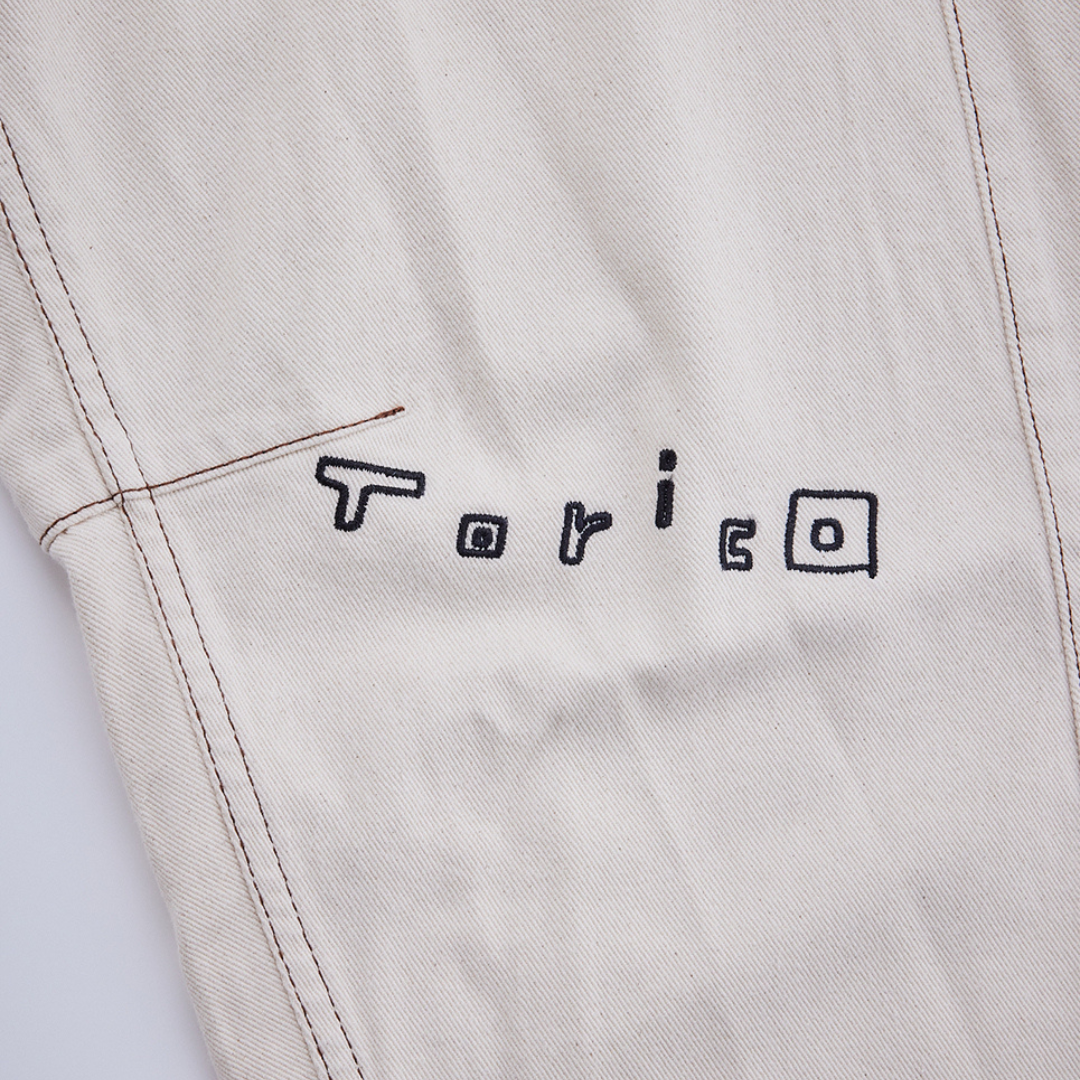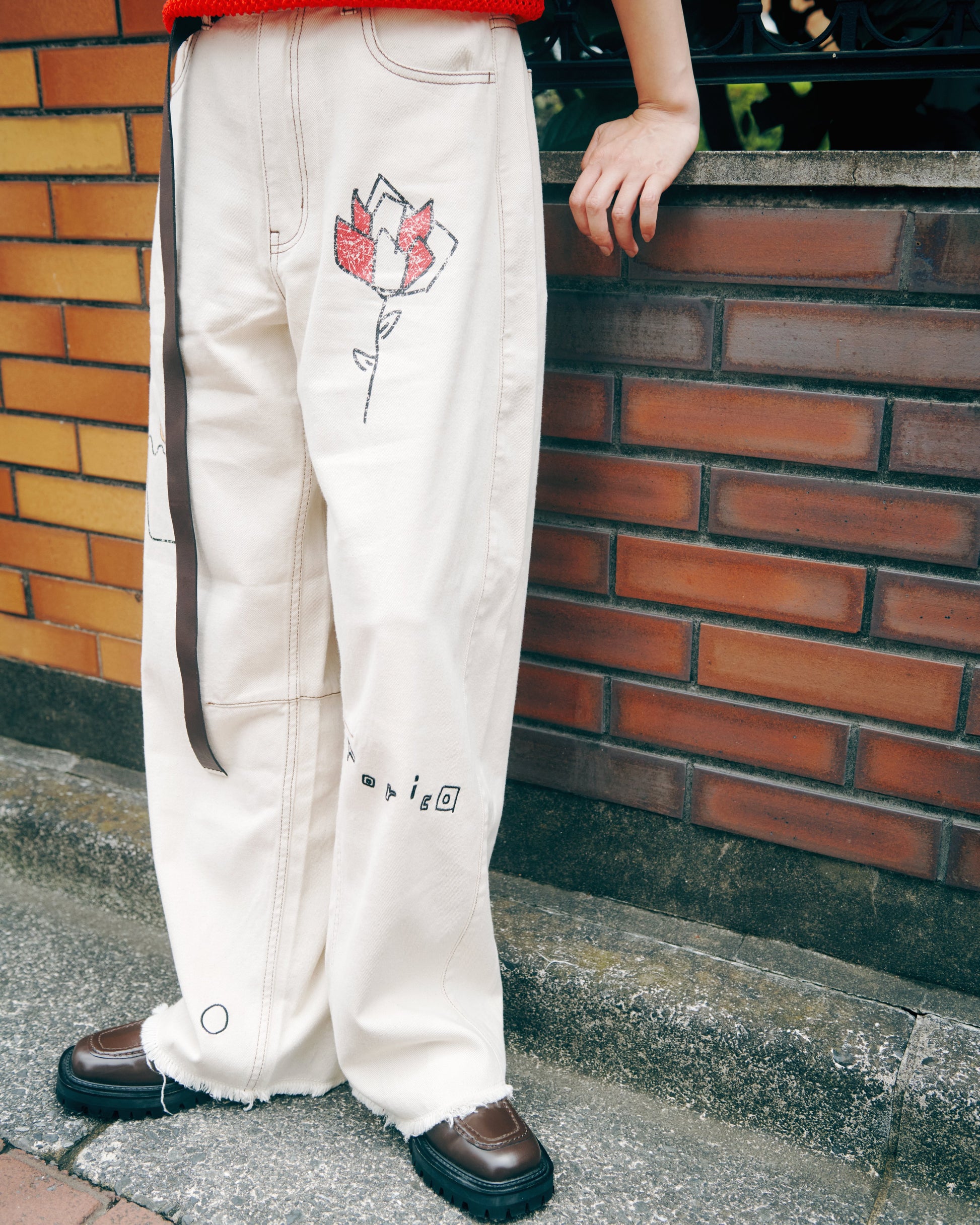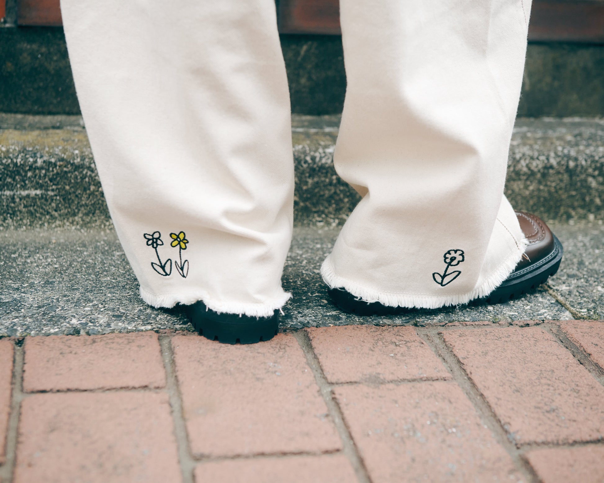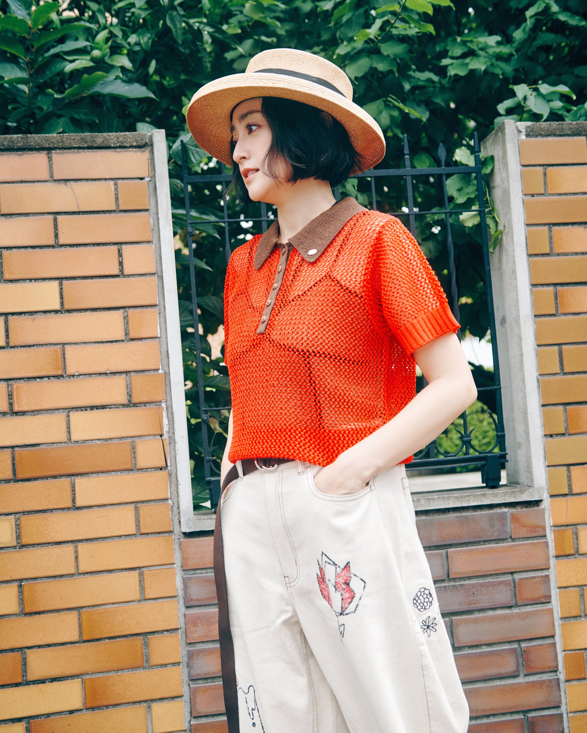 「Torico Knit Polo Shirt」の襟のプレートと呼応するお花モチーフが大胆にプリントされ、セットアップ風に楽しむのもおすすめです。