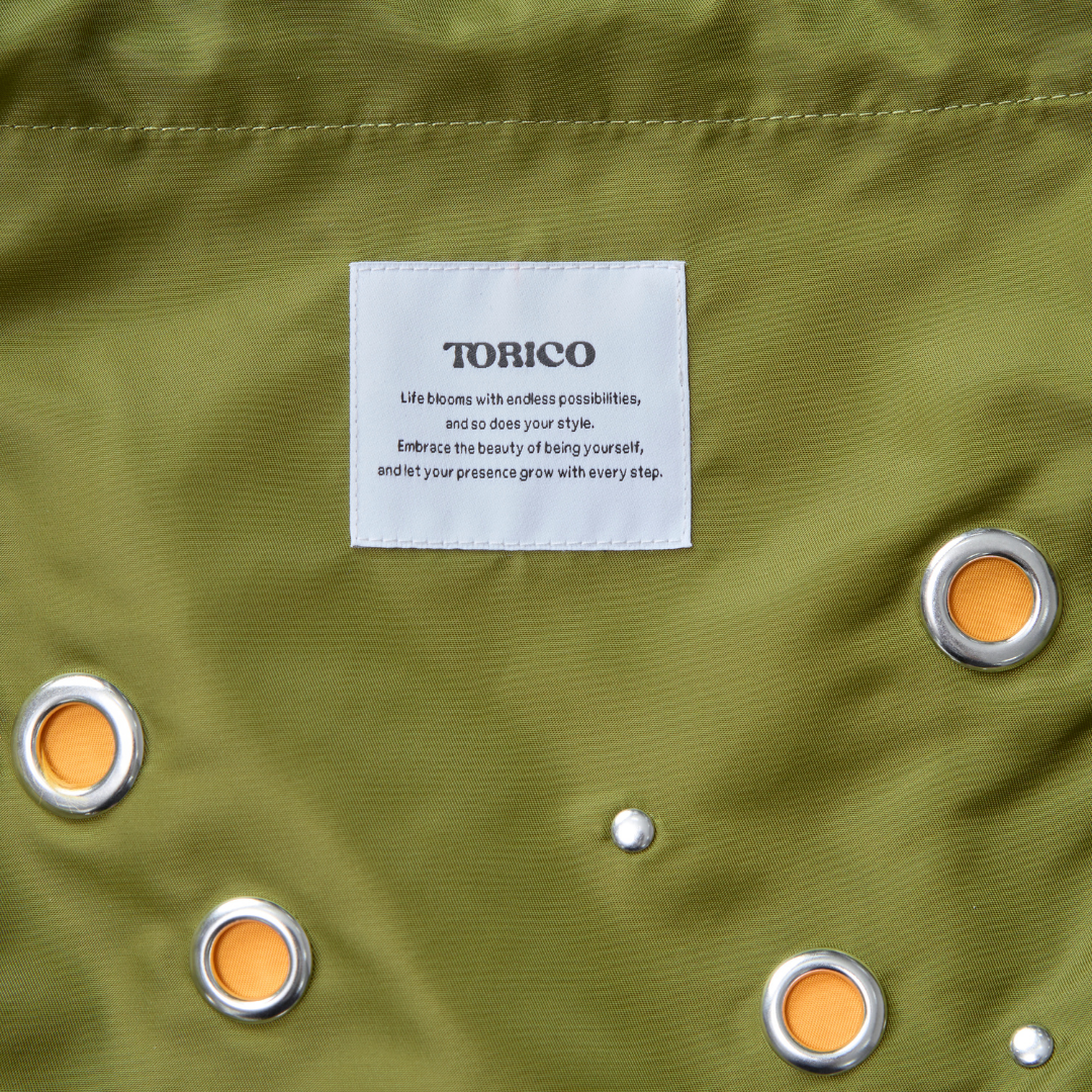 バイカラーな差し色と大きなフリルで、存在感のあるトートバッグです。散りばめられた大小の丸形のハトメディテールが、スタイリングに程よいエッジをプラス。