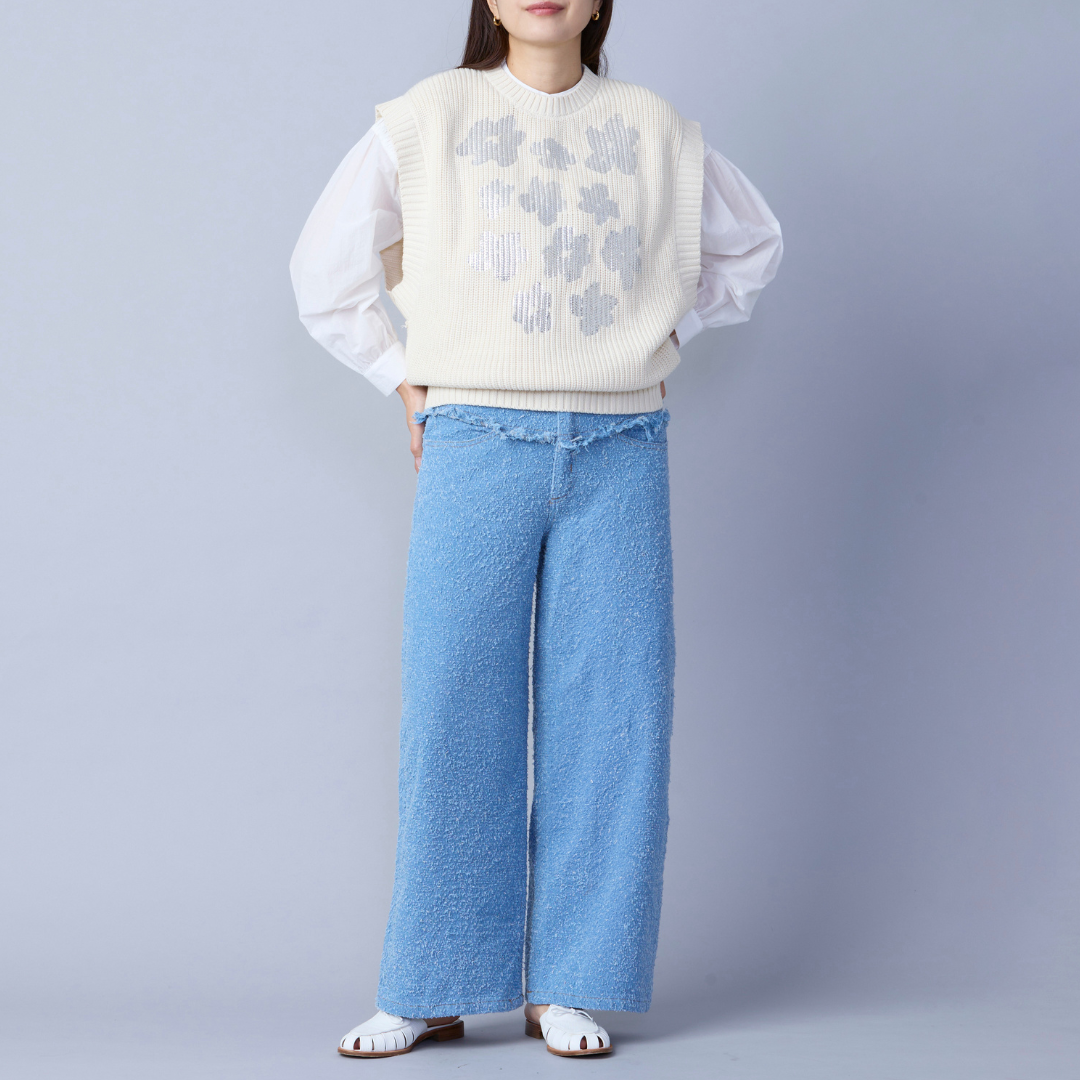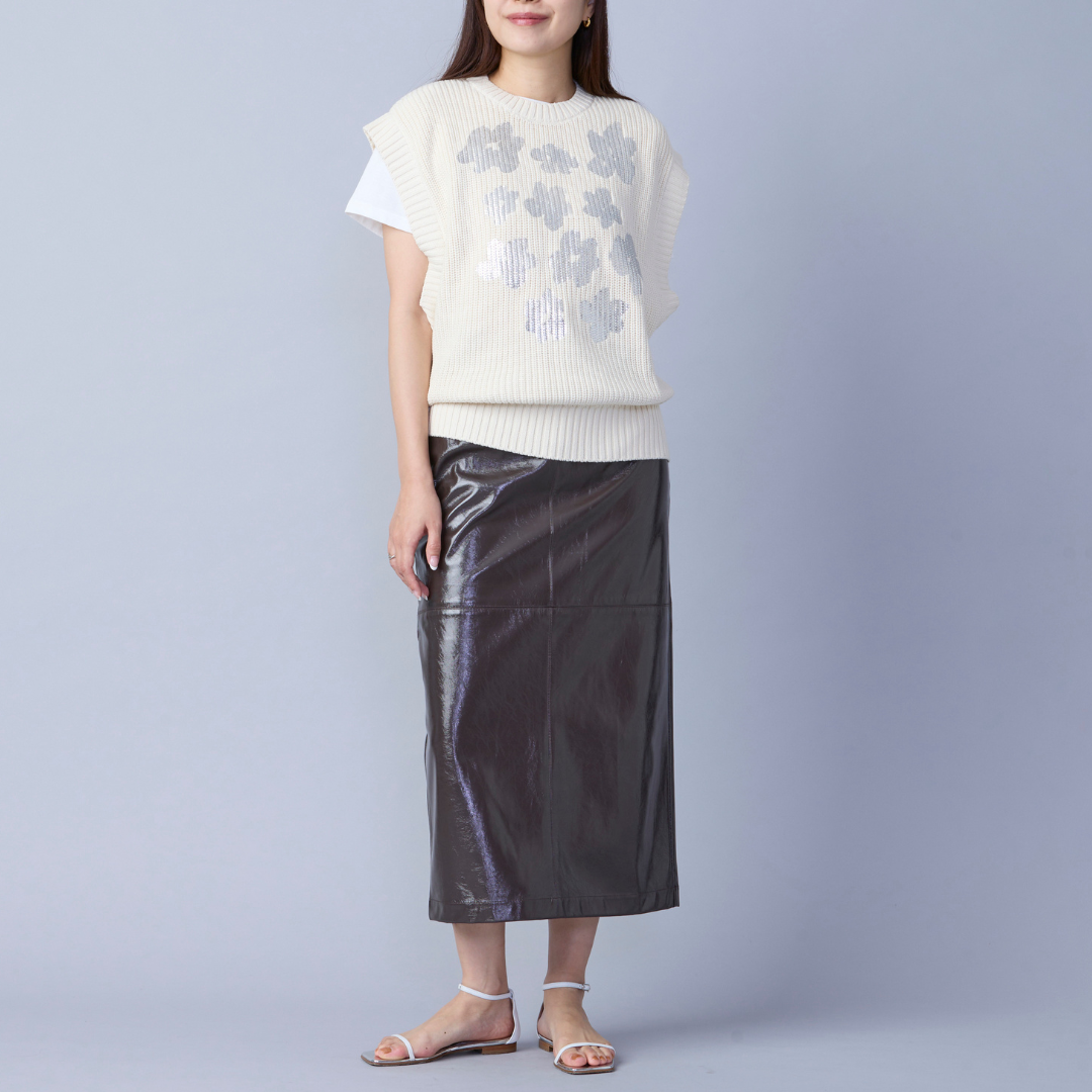 春先にレイヤードでも一枚でも使えるニットベストです。フロントには、花モチーフのシルバー箔をプリント。ナチュラルな風合いのアイボリーのニットに光沢のスパイスを加えました。