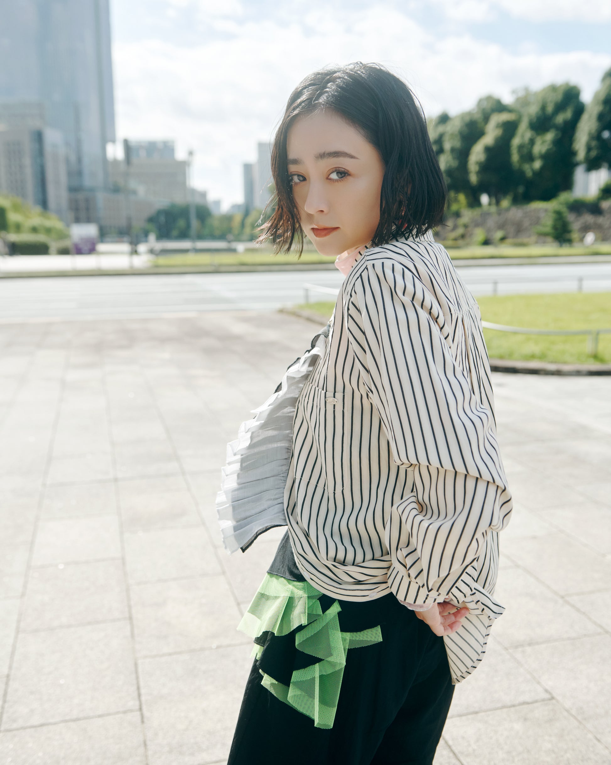 チュールは蛍光グリーンで差し色を効かせて。シンプルなトップスと合わせても、スタイリングに奥行きが生まれる一枚です。